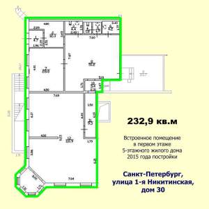 Встроенное помещение 233 кв.м расположено в первом этаже пятиэтажного жилого дома 2015 года постройки на 76 квартир, нежилой фонд, пять комнат, четыре санузла, отдельный вход, окна - на улицу, электричество - 40 кВт, потолки 3.31.